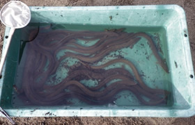 石倉カゴを家にし、捕獲されたウナギ40個体