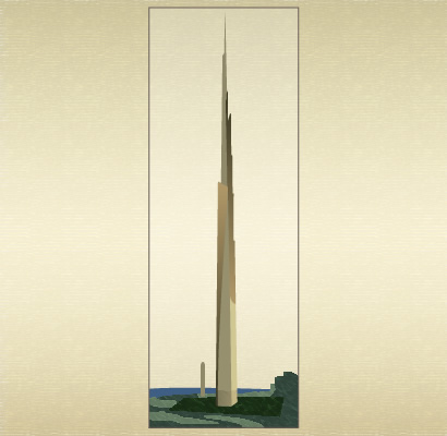 1956年、建築家フランク・ロイド・ライトは、1マイル(約1,600m)の高さのTVアンテナ塔の設計を依頼されましたが、彼は究極の超高層として構想してみせました。それは、揺れを防ぐ為の三脚状の構造と、地上の広い基壇から頂上まで立ち上がる傾斜した外壁を持つ、10万人の都市といえるものでした。