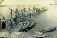 4,000本の松丸太杭を対岸から船で運搬、玉石3万m³は鉄道輸送。玉石、砂利、空俵、蛇籠の輸送には70台/日のトラックが動員された。水勢強く、流されながらの杭打ち。隙間から吹き上がる水。蛇籠は流され、深浅図は刻々変化する。第二締切では杭の間に古畳、土俵を入れたが、水流で杭が傾く。畳は潜水夫もろとも浮き上がる。土俵も水中に踊り出す。竹竿格子に莚(むしろ)張りも失敗。そこで鋼矢板に変更した。総数731枚。並行して砂利俵詰、土俵詰、土の中詰作業。最後の締切には54歳の高橋も水中に飛び込んで作業員と俵詰をした。10日には鹿島婦人会(*6)が統制品の砂糖等を使った手作りおはぎ300個を差し入れ「東京でも口にできない品」と喜ばれた。