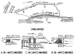 決壊口締切図と締切工横断面図クリックすると拡大します