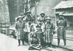 明治から大正にかけての現場代人(今の現場所長)と呼ばれる人たちの服装は、背広の上着に紺織の股引、腹がけ、ねずみ色の鳥打帽と云うのが一般的だった。また、鳶や大工などの職人たちは、ぴたっとした股引に、腹がけ、半纏姿。足にはわらじをはいていた。