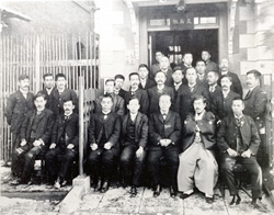 明治42年正月。鹿島組木挽町本店前で。前列右から二人目・精一副組長、その隣・岩蔵組長、その隣・龍蔵理事 クリックすると拡大します