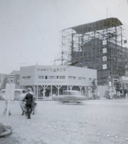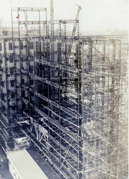 鉄骨建方。昭和27(1952)年2月22日。奥に1月に竣工したブリヂストンビルが見える。 クリックすると拡大します
