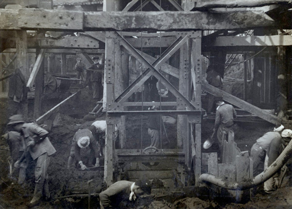 この時代の建築現場ではヘルメットをかぶることはない。 クリックすると拡大します