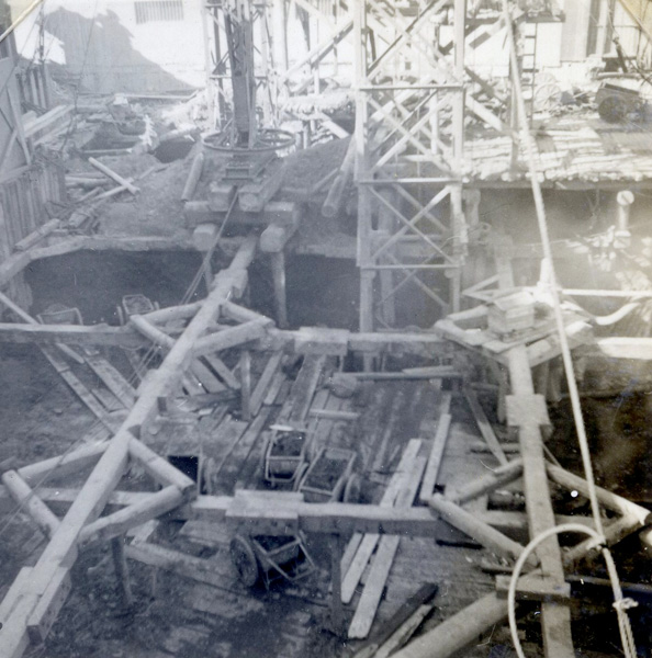 根切(地下の掘削)はもちろん手掘りである。機械化されたのは70年代に入ってからだという。山留壁には鋼製のシートパイル(矢板)が用いられた。越前屋ビルに用いられたのはIII型と呼ばれるものだった。シートパイルは現在はVI型が主流で、強度は3倍ぐらいまで高くなっている。矢板が崩れないように抑える「腹起し」や切り梁には300×300の松材が使用された。