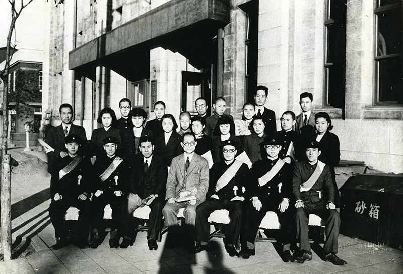 学徒出陣。昭和18(1943)年11月13日鹿島組本社前にて調査部。中央が調査部長・塚田十一郎クリックすると拡大します