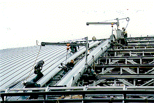 ![]() 西武ライオンズ球場の工事では、「屋根材搬送敷設装置」を開発・実用化した。本装置は、円周上に設置してある本設母屋上を電動で自走し、所定の位置に搬送してチェーンブロックと吊冶具で敷設する。 |