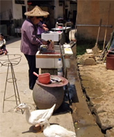 食事時は土楼内部が最も賑やかになる時間である。各家が一斉に1階で食事の準備に取りかかるので,隣の家では何を作っているか手に取るように分かる。隣近所で一緒に料理をしたり,作った料理をみんなで分けるのは,文字どおり日常茶飯事の光景だ。建物の玄関(エントランス)を入ると椅子が置かれていて,住人が座ってお喋りを楽しむコミュニティ・スペースになっていたり,他にも顔を合わせるための工夫が随所に見られる。