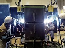 多層盛溶接ロボット「石松」による施工状況。オペレータがロボットを操作して施工を行う