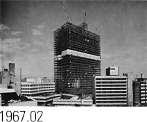 昭和41(1966)年7月1日から鉄骨建方工事が開始した。鉄骨は,柱は大型厚肉H形鋼,梁はスパン15.6mの長大ハニカムビームを用いた。使用した部材の総重量は1万5,000t,ピース数は1万7,000に及んだ。セルフクライミング式のタワークレーン設置後は1日100tを基準として揚重作業を行った。柱の垂直管理は下げ振りを使用,上階は風が強いため塩ビ管内にピアノ線を垂らした下げ振りで精度管理に努めた。鉄骨建方は昭和42年3月に完了した。
