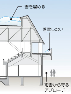 大屋根は,フラットルーフでパラペットが深く落雪させない形状となっており,2階の外回廊は雪を溜めることができ,利用者の安全を確保する。雪国特有の庇を長く差し出して下を通路とする雁木を模した1階の雁木状プロムナードも,利用者を雨や雪から守ることができるように設計されている。雪との付き合いは,施工中よりも完成後の方が長くなるため,こうした備えが重要となる。