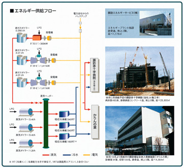 熱供給は,冷房用として冷水,暖房・給湯用として蒸気を供給している。発電機からの排ガスを排ガスボイラーによって回収して蒸気を製造,また3基の蒸気ボイラーとの組み合せで,熱需要量にあわせて蒸気を製造する省エネルギー型システムである。