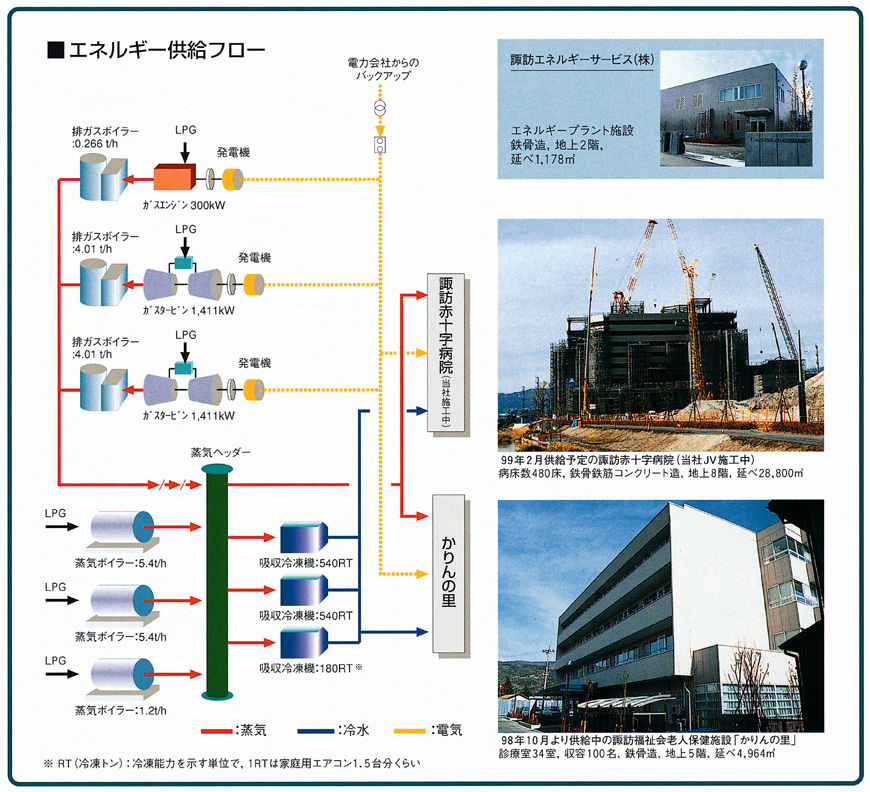 供給プラントは鉄骨造2階建延べ1,178u,発電能力は,ガスエンジン1基・ガスタービン2基をあわせ合計約3,000キロワットである。電力供給先は隣接する老人保健施設と,現在施工中の諏訪赤十字病院で,供給電力は約1,500キロワットである。