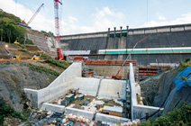現場を訪ねた10月上旬は,11月末から入る冬期休止期間を前に,堤体コンクリートの打設作業が佳境を迎えていた。堤体の下流側には750t吊りと350t吊りのクローラクレーンが1台ずつ,堤体天端付近の両岸にも200t吊りのクローラクレーンが1台ずつ据えられ,資材やコンクリートの搬送をひっきりなしに行っている。