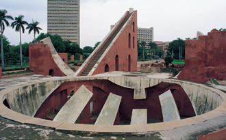 ジャンタル・マンタルという言葉は,計測器という意味をもつが,そのほか「魔法の仕掛け」という意味もある。その名のとおり観測儀ひとつひとつに施された異なる仕掛けが,競うようなデザインとなって立ち現われ,ほかに類を見ないような建築群である。それぞれ観測目的ごとに,純粋幾何学に基づいた精密な計算によってでき上がったものだ。正方形,三角形,円から構成される形態は,測定に必要最小限の機能を形にしたものであり,不要なものは一切ないが,じつにユニークだ。実際ここを訪れてみると,宮殿の庭に個性的な観測儀が並ぶ姿は,現代ではむしろ最先端のデザインにすら見え,まるで屋外彫刻の美術館のようでもある。