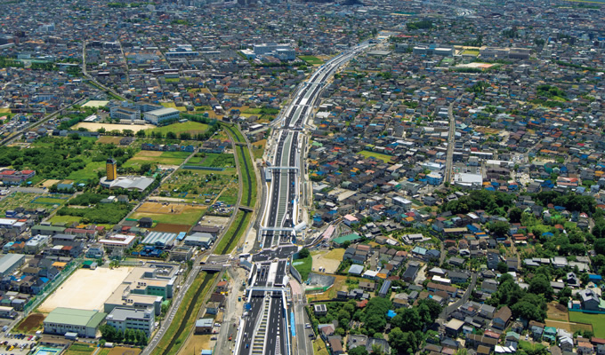 都心の渋滞緩和や防災機能の強化,観光交流の促進などを図るインフラ整備の一環として,当初計画から半世紀を経て6月,待望の開通となったのは東京外かく環状道路(外環道)の千葉県区間。延長約12kmのルートのうち,当社は8つの工区の施工を手がけた。沿線の住宅地への環境配慮などのため,ほとんどの高速道路部は地下,国道部は地上,その両側に緑の豊かな環境施設帯を設けた半地下(掘割スリット)構造となっており,技術の創意と工夫が随所に注ぎ込まれた。
