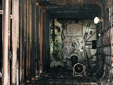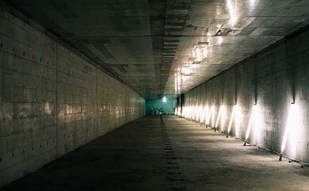 後ろから見たシールドマシン。 鉄筋コンクリートによる二次覆工が完了するまでは,仮設の中柱がトンネルのセンター部分を支えている |