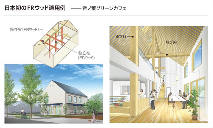 現在,当社が設計を担当する「音ノ葉グリーンカフェ」(東京都文京区,2013年4月竣工予定)の独立柱と飛び梁にFRウッドを初めて適用しています。ここは明治の要人,田中光顕の屋敷だった蕉雨園や野間美術館に隣接する敷地で,目白通り沿いは防火地域のため耐火性が求められます。FRウッドを採用することで,石膏ボードに覆われない“木の見える”空間が防火地域においても実現されました。