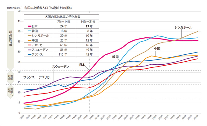 高齢化率(総人口に対する65歳以上の高齢者人口の比率)が7%超で高齢化社会,14%超で高齢社会,21%超で超高齢社会と称される。高齢化率が7%から14%に達する年数(倍化年数)を国ごとに比べると,フランスが115年,アメリカが65年に対し,日本はわずか24年(1970~1994年)とその進行のスピードが示されている