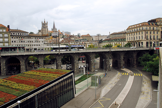 広場の脇に立つスケルトン構造のエレベータータワーで上がると一気に景色が開ける。広場にはその名もGrand-Pont(大橋)と呼ばれる石積みの長い橋が横切っており,奥には丘の上に建つローザンヌのシンボル,大聖堂が望める。