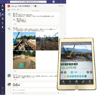 iPhone,iPadによるTeamsの活用で,現場,現場詰所,長野営業所での職員同士の情報共有を可能にした。写真や動画も添付でき,昼夜体制での引継ぎ業務や緊急退避などに活用された。