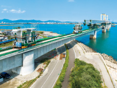 橋脚8基も当社JVが施工した。河口に位置する現場は,海からの波や干満の影響を受けることから,海洋工事としての側面が強い。さらに浚渫工事,基礎工事,橋脚工事,セグメント製作工事,セグメント架設工事など工種が多岐にわたる。まさに当社の総合力を存分に発揮できる現場と言えるだろう。