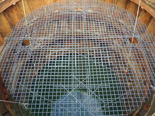 対策として,底盤には比重が高い重量コンクリートを使用した。ただし,あくまでもコンクリートの重量で押さえ付けるためのもので,水圧で壊れないという確証はない。底盤にひびが入れば,漏水して井筒内が水没する恐れがある。そこで,従来は無筋の底盤を鉄筋で補強することによりその上に頂版が構築されるまでの間の安全性を高めた。