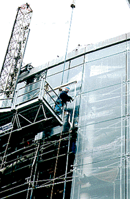 ▲ガラス壁設置作業中。DPG用強化ガラス(2m×2m)1278枚、カーテンウォールガラス(1m×2m)1362枚を設置する。