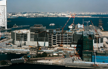 横浜ワールドポーターズ建設工事は,新しい都市づくりが進むみなとみらい21地区内にある現場だ。輸入品の展示,卸,販売を中心とした大型商業施設で,ノスタルジックな外部空間とコンテンポラリーな内部空間をコンセプトにしている。ここでは柱RC造,梁S造のニューNEOS構法を主体とした架構を用い,今夏竣工を目指している。 |