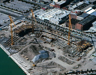サンフランシスコジャイアンツ球場建設工事は,日系企業による初の米メジャーリーグ球場建設本格参入の工事である。現在杭基礎工事が完了し,タワークレーンの建方も全て完了した。サイトでは躯体工事が本格化してきている。新球場は店舗・レストラン・劇場を含めた複合娯楽施設であり,市民挙げての支援は変わらず,オーナーによる指定席の販売も予想以上に好調である。2000年4月開場を目指して工事は進んでいる。 |
