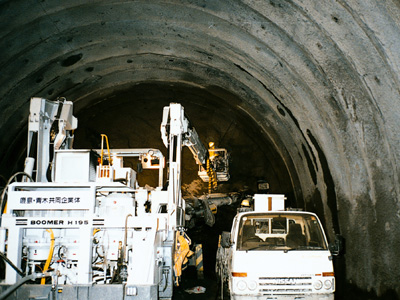 九六位トンネルは,東九州自動車道の大分市郊外九六位山の直下をほぼ南北に通過する総延長2,247m区間において,山岳トンネルと切盛土工事をおこなうもの。NATM発破開削工法により4.0m/日でトンネル施工中である。 |