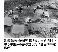 | 1947年になって,本格的な発掘が始まる。木鍬や鋤などの農耕器具や田下駄や琴,丸木舟など出土品は多彩だった。これらは,1955年に遺跡の奥に建造された静岡考古館(1972年開館の静岡市立登呂博物館の前身)に収められた。弥生時代の住居や水田も復元された。 登呂遺跡は,1999年から5年計画で,半世紀ぶりに遺構発掘調査が行われ,新たな遺構発見で弥生後期の農耕遺跡を再びアピールした。36年間登呂遺跡に関わってきた登呂博物館嘱託の中野宥さんは「住居内部で火を燃やした可能性があること,粘土を交互に叩きしめて住居内の防湿効果を高めるなど,快適な住環境を求める工夫もしていたのです」という。 今回の遺構発掘に際しては,戦中戦後の発掘に携わった当時旧制中学の19人がボランティアとして参加した。「見渡す限り田んぼが広がっていて,たいへん見通しがよかった」「毎日何かが出てきて,新しい発見があった」「学徒動員でプロペラ工場へ行き,同じ場所で遺跡の発掘に携わった」。静岡市教育委員会の発掘調査ニュース(2001年1月9日発行)に,参加者のこんな話も載っている。鉛筆や消しゴム,竹べらや仁丹など,半世紀前の発掘の際の“忘れ物”も出土したという。 現在は,再発掘調査の結果を受けた登呂遺跡全体の再整備事業が行われている。登呂博物館も建替えのため休館中だ。登呂遺跡は2011年3月までに復元を終え,博物館は2010年秋を目処に,参加体験型のミュージアムとしてリニューアルオープンする。 弥生期の集落としては,その後奈良県の唐古・鍵遺跡,福岡県の板付遺跡,佐賀県の吉野ヶ里遺跡などが見つかった。しかし中野さんは「登呂は他の遺跡とは違う」との思いが強い。弥生の暮らしと稲作の様子を初めて明らかにした遺跡として,国の特別史跡の指定を受けただけではない。登呂遺跡は「敗戦のダメージの中で,日本人に新しい文化・歴史観を共有させる原点になった」との自負がある。 一方,「登呂の弥生人のコメにかける執念が遺跡から伝わってくる」というのは,静岡市文化財課の大村和男さんだ。「海岸に近い扇状地にある登呂の農耕は,条件的には恵まれたものでなかった。矢板を打ち,土留めをして軟弱な地盤を開墾し,畦や水路を設けた。遺構から土木作業の苦労のほどが分かるのです」。 起工式に望む2人の足元に,登呂の遺構は眠っていた。そして小長井は出土した土器を中田国民学校に保管した。それが結果として登呂遺跡発見に結びついたのだった。 |