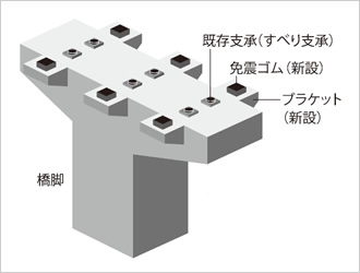 阪神・淡路大震災では,重要なライフラインの一つである高速道路の高架橋が横倒しとなり,それ以降,耐震補強が急ピッチで進められた。当時,鉄板や鋼線などを橋脚に巻き立てるのが一般的だったが,地震力の低減を図り,橋梁上部の変位を抑える免震化技術が注目を集めた。震災直後から,この技術の必要性を強調していたのが技術研究所の野尻所長。震災から8ヵ月後には,新原グループ長も関わった大型振動台での実験が行われ,実用化に目途をつけた。供用中の橋梁の上部工と下部工の間に,免震ゴムを設置して水平力を吸収する仕組みで,今では,多くの実績がある一般的な工法となった。