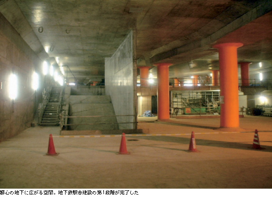 108m),平均深さ30mに及ぶ地下巨大空間が必要とされた。 地下空間づくりは,明治通りに杭を打ち込み,地中に壁をつくることから始まり,その後,地上からの開削で施工された。難関は,都内でも屈指の利用者数を誇る半蔵門線渋谷駅の直下を掘削すること。既存の構造物の基礎部分を,新設もしくは修復補強して荷重を受けかえる「アンダーピーニング工法」が採用された。まずは,既存の駅構造物の真下に8列の横穴(導坑)を掘り,その穴から鋼製の杭を合計112本打設。導坑に沿って渡した鉄骨桁を杭に載せ,8列の鉄骨桁で副都心線と直交する区間の駅構造物(総重量24,500t)を支えた。 大都市の地下には,その他にもガス導管や下水道管などの大型地下埋設物が多く存在。工事は,それらを防護しながら慎重に進められ,「地宙船」を埋め込むための地下空間が出来上がった。 |