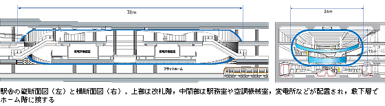 | 新しい渋谷駅は,新設された7つの駅の中で最大の規模を誇る。東急東横線との相互直通運転が予定されているため,「4層5径間ホーム2面軌道4線」タイプの駅舎となり,最大幅36m,長さ530m(うち当社JV施工部分