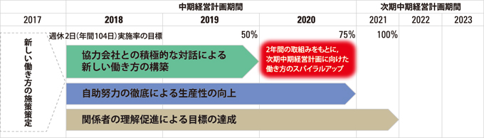 さらに,全社員を対象に2018年度中の導入に向けた具体的な人事諸制度の拡充策が現在検討されている。社員一人ひとりが活力をもって働ける職場環境を整備し,職場の繁忙・特性を考慮した柔軟な働き方を推進するために,所属長裁量制,時間単位年休,勤務間インターバル制度,在宅勤務制度,退職者復帰制度などについて検討し,2018年度中の導入を目指す。