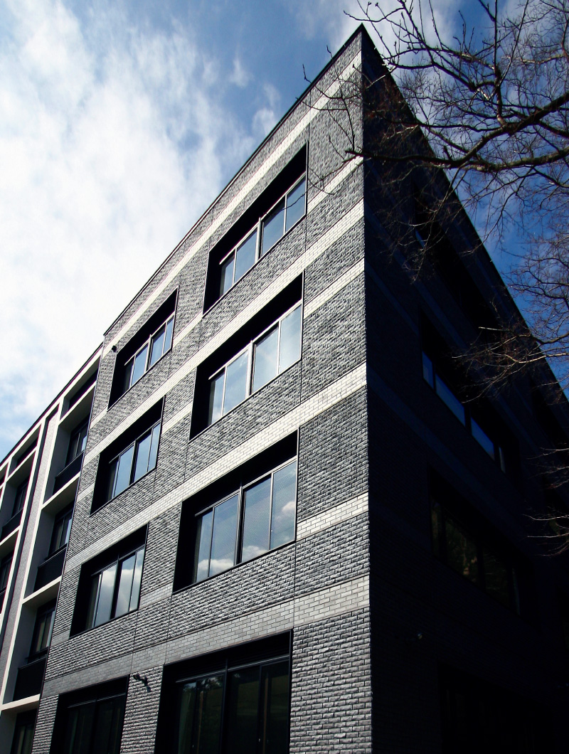 外観は,既存校舎のフレームワークを活かすことで,かつての面影を残した。素材には,周辺景観との調和に配慮しながら教育理念である質実剛健を表現するため,燻し瓦を想起させる重厚な還元焼成タイルを採用した。メインのファサードには学園の歴史の積層と鎌倉随所の切通しに見られる地層のイメージを重ねて平タイルのボーダーをアクセントとして用い,天候や時間帯によって刻々と変化する表情を演出した。