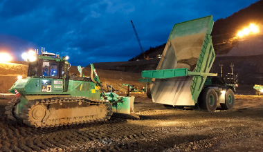 秋田県雄勝郡東成瀬村にて建設が進む「成瀬ダム堤体打設工事」。成瀬ダムの規模は堤高114.5m,堤頂長755.0mで,完成すると台形CSGダム※として日本最大となる。この成瀬ダムで当社は,A4CSELを全面的に導入し,23台の自動化重機による本格的な堤体打設に挑戦する。