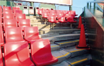 そのスタジアム自体も,地震による被害は大きかった。スタジアム入口となる北口エントランス広場,観客席階段の踏み石,構造体の継ぎ目部分の観客席シートなど, 度重なる余震で被害箇所は次々と増えていく。スタジアム内部の割れたコンクリート片は,すべて落下させてから修復作業を開始した。
