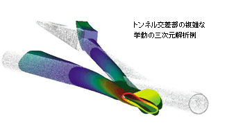 「オクトパス工法」は複数のマシンが横に連装されており,所定の位置でそれらが「蛸足」のように分岐していく。ワギング・カッターなどの自由断面掘削技術と組み合わせることで,さらに多様な地下空間を創出することができる。道路の非常駐車帯などでは,トンネルの一部が拡幅されるかたちとなる。2つのタイプがある「VASARAシールド工法」は,いずれも,本線部は必要最小限の円形トンネルを構築し,必要な部分だけを拡幅施工することを可能とした。 トンネルの交差部や拡幅部などでは,地震時の構造的な挙動も複雑となる。安全かつ効率的なかたちを実現するために,地震時の動きを考慮した三次元解析など,高度な設計手法が駆使されている。 |