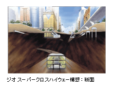 都市の交通網を再生する 「ジオ スーパークロスハイウェー」構想 より魅力的で国際競争力のある都市の構築を目指して推進される都市再生。大深度地下利用法の施行などを背景として,民間からも都市の地下を利用した様々なプロジェクト構想が検討されている。そこには,インフラの再整備や拡充といった従来の概念の延長だけではなく,21世紀に必要となる新たな発想で築かれる「都市の明日」の姿をみることができる。 2000年11月に当社が提案・発表した「ジオ スーパークロスハイウェー構想」もその一つだ。この構想は,首都圏の東名高速道路と東北自動車道を結ぶ約35kmのルートと,お台場(首都高速湾岸線)と関越自動車道を結ぶ約30kmの二つのルートを,それぞれ大深度の地下トンネルで構築するものである。2本のルートは,それぞれのほぼ中央に位置する大深度地下に構築されるジャンクションで接合し,相互のアクセス向上も目指している。
