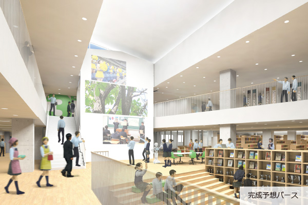 学校の中心となるメディアセンターの計画は,3Dを活用しながら児童・生徒目線で使いやすさを検証。たくさんの本を目にする機会とともに,動線・視線の抜けによるにぎわいを創出する計画だ