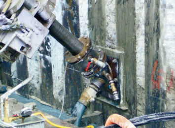 高い水圧下において通常のアンカー施工を行った際, 多量の土砂が噴出し, 地盤の陥没や, アンカーの引抜けなどの事象が発生する場合がある。「耐高水圧アンカー工法」は, 特殊な止水装置と施工手順で水・土砂の噴出を防ぎ周辺環境に悪影響を及ぼさない特長を持つ。そのため重要構造物近接での施工に有効で, 実績も多数有する。