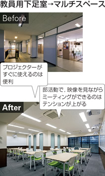 このリニューアルにともない,鎌倉学園全体で大きく変わったポイントがある。それは上履きを廃止したこと。一足制とすることで昇降口から下足箱が姿を消し,ICT完備のマルチスペースや自習室となった。職員室に近接し,校舎のハブに位置するこれらの諸室は,コミュニケーションの場へと生まれ変わったのである。新たに4台のプロジェクターが設置され,生徒たちのグループワークや映像を使ったクラブミーティングなど,学習用途を超えて活用されている。リニューアル後の空間でとくに人気が高く,放課後はつねに人が絶えないという。