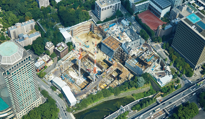 当社JVはオフィス・ホテル棟の施工を担当する。地上36階建て,高さ約180mの超高層ビルは,1~4階が約40区画の商業施設,5~28階は貸付面積が1フロア1,000坪を超える都内屈指の広さを誇る開放的なオフィスとなり,30~36階に客室数約250室のホテルが設けられる。設計・監理は日建設計が行い,外装デザインは米国の設計事務所コーン・ペダーセン・フォックスが務める。