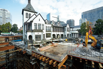 なかでも,現場を悩ませたのが高低差と旧李王家東京邸の存在だった。この歴史的建築物を保存しながら地下を構築するため,建物下部を掘削する間,1万6,000tの荷重を鉄骨柱で支えなければならない。しかし高低差があるため控えを取ることができず,万が一,施工中に地震が起きた際の揺れによる倒壊を防止する必要があった。「ここに関しては発注者も心配されていました。お互い技術者ですから工事の難度がわかるわけです」(松井副所長)。そうしたなか,複雑な構造解析など全社から技術的なバックアップを受け,建物を支える鉄骨柱に梁やブレスを手当てして無事工事を進めることに成功した。