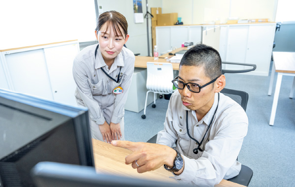 SAとして今回が3現場目の原いずみさん(当社グループ会社OneTeam所属)。SAになる前は,ショップ店員や建設会社での事務・CADオペなどを経験してきた。現在は,2本の柱の業務ほか,デジタルサイネージの掲示データの作成,ドローンでの定点撮影を行っている。当現場では新たに,当支店で初導入となる鉄筋検査帳票作成ツールの運用やそれに派生するベンダーとのシステム開発の窓口業務なども担う。原さんは「現場の皆さんは建設の知識があるのは当然ですが,ICTツールにまでは手が回らない方も多いと思います。自分がICTツールの知識を深めることで皆さんの負担軽減につながり,組織のバランスも良くなればと思います」と,特にICTツール関連の支援にやりがいを感じているという。また「業務上の疑問などは支店の生産推進サポートグループに相談をしています」と支店の支援体制が整っていることが働きやすさにつながっていると話す。