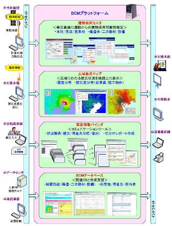 BCMプラットフォームは、地震発生直後に被災状況や復旧対応状況に関する情報を共有する「統合情報基盤」であり、1.発災直後に首都圏の当社の拠点施設の被災状況を推定表示する建物被災モニタ、2.広域震度分布や従業員、当社施工物件の被災推定結果を表示する広域被災マップ、3.実際に現地で確認した情報を伝達整理する緊急情報バインダ、4.被災推定のために必要なデータを蓄積しておくBCMデータベース、の4つからなります。