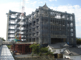 2011(平成23)年初めには屋根や外壁で鉄骨の骨組も覆われ、約3年の保存修理工事期間、大天守はその姿が一時的に隠れます。素屋根の内部には作業スペースの他に、上層部に見学スペースが設けられ、修理工事を間近に見ることができます。
