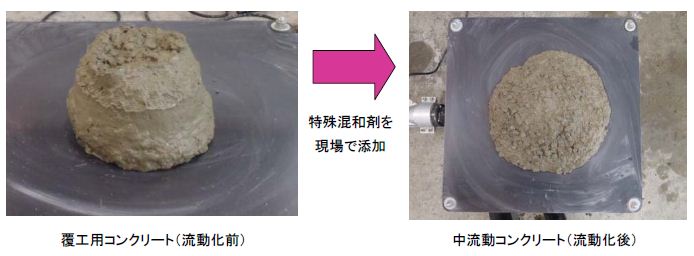 本工法は、現場にアジテータ車で搬入されたスランプフロー15cm程度の通常の覆工用コンクリートに、特殊な混和剤を打設直前に現場で添加して流動化し、スランプフロー40cm程度の中流動コンクリートを製造するものです。